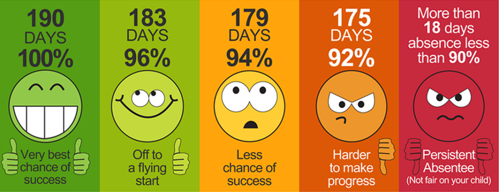 90 – 95.9% Concerning | Absence is now affecting attainment and progress at school. School will monitor reasons for all absences with the school office, family support worker and Headteacher. You may be required to attend meetings and work with the school urgently to improve the situation. |